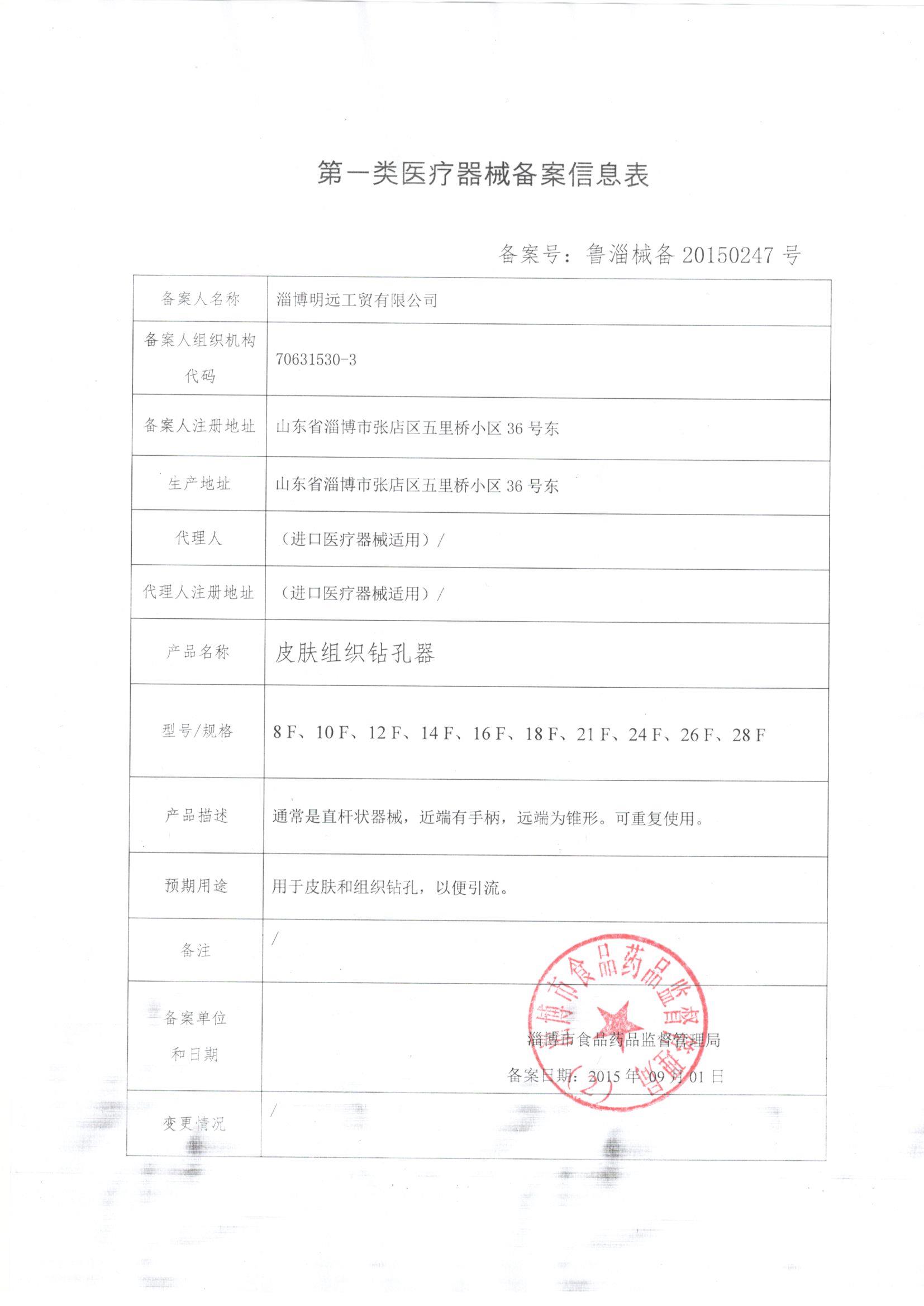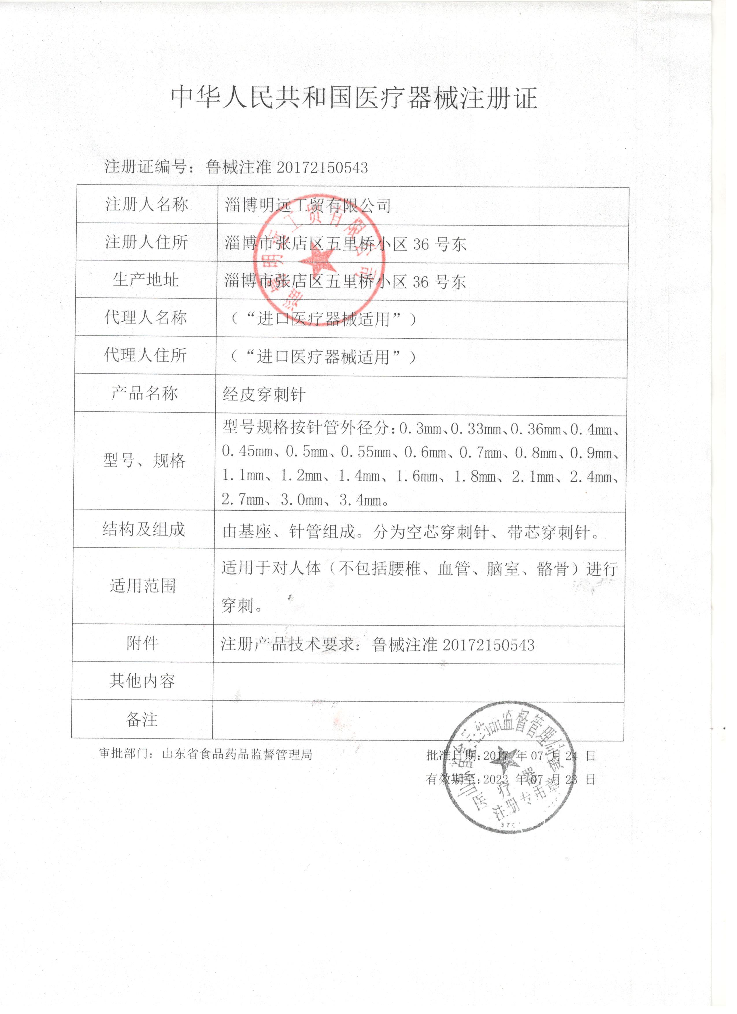 淄博明遠工貿有限公司 公司成立于2000年,是二類醫用穿刺器械專業生產廠家。公司以微創手術器械為發展方向,產品以各類特種穿刺針為主。我們以全方位的管理手段,嚴格地控制產品品質.歡迎您選用我公司產品并對我們的產品提出建設性的建議和意見.我們愿意成為您好的生意伙伴和知心朋友。